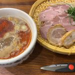 つけ麺macroのレギュラー大盛りを注文。極太麺はコシが強く、小麦の風味もしっかり感じられます。麺は一本一本がとても長く、そのままだとすすりきれないほどなので、卓上のハサミでカットしていただきました。